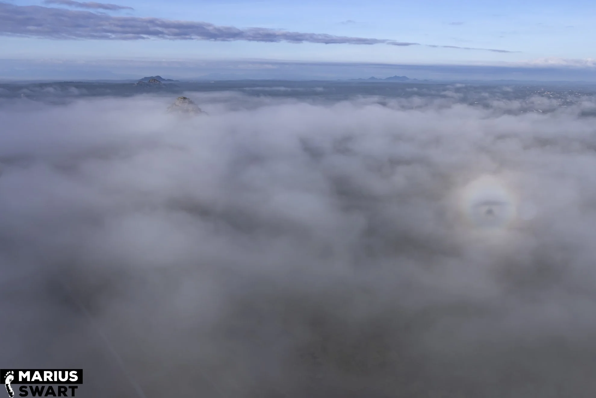 Another long-awaited phenomenon which I was privileged to be privy to, is Pilot’s Glory. Sunlight is diffracted by water droplets in mist or cloud to create a circular rainbow around the shadow of the aircraft.